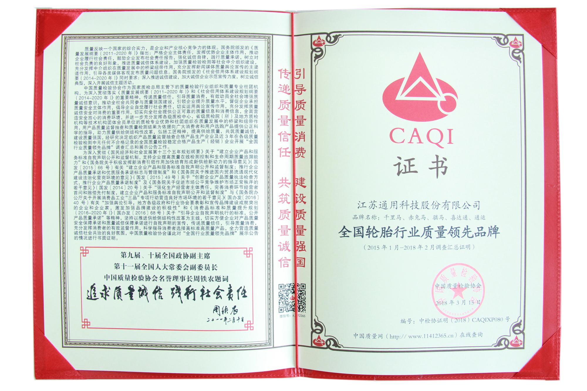 近日,在由國家質檢總局和中國質量檢驗協會聯合開展的“產品和服務質量誠信承諾”主題活動中,通用股份榮獲“全國產品和服務質量誠信示范企業”、“全國輪胎行業質量領先品牌”稱號。