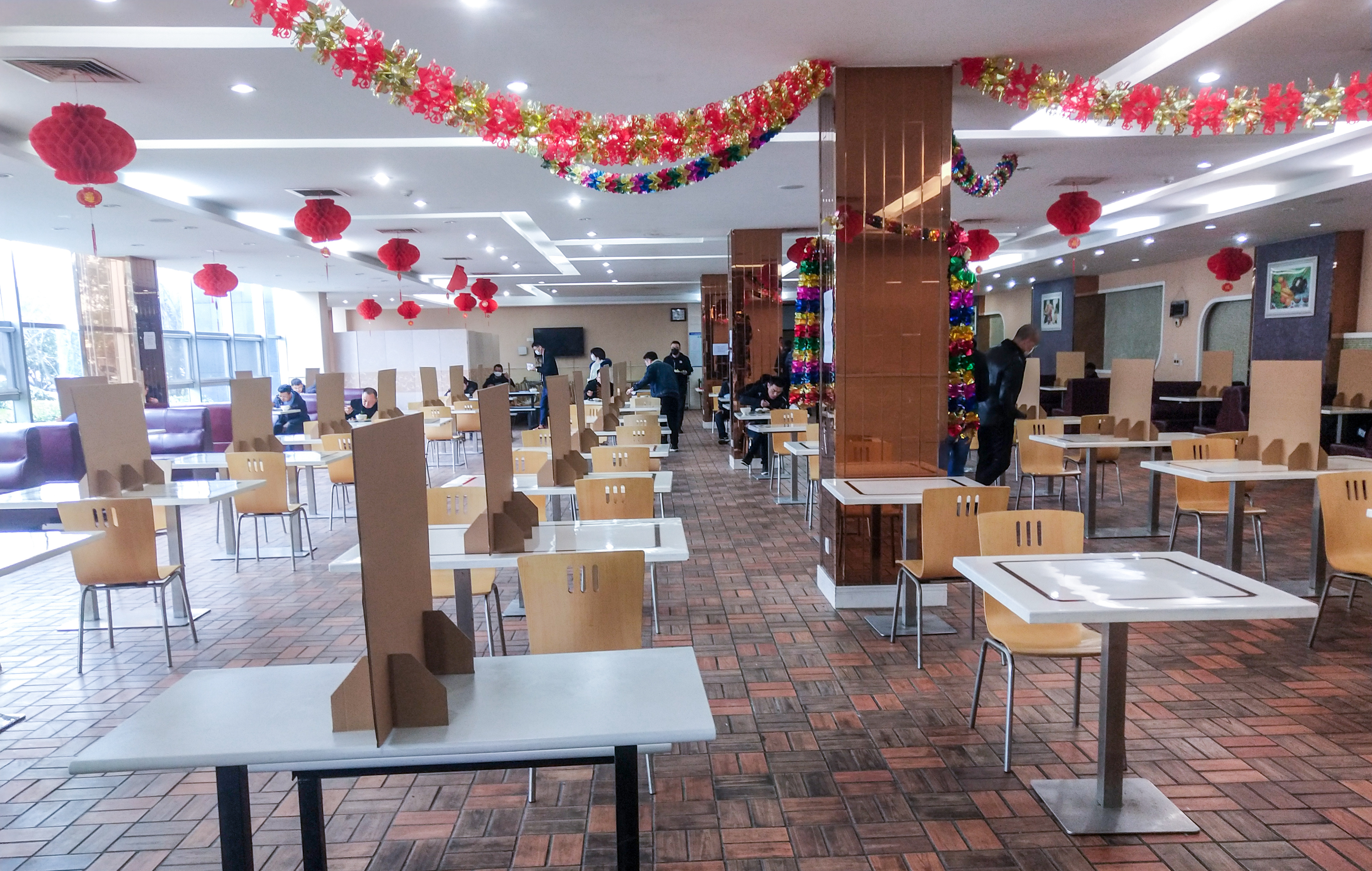 公司食堂實(shí)行人員錯(cuò)峰分流措施,員工就餐分時(shí)分批、限時(shí)限流,避免人員在食堂中聚集,進(jìn)食堂前需檢測(cè)體溫,排隊(duì)取餐需間隔一米,每桌限坐2人,中間用板隔開(kāi),且一律同向而坐,避免隔桌交談。